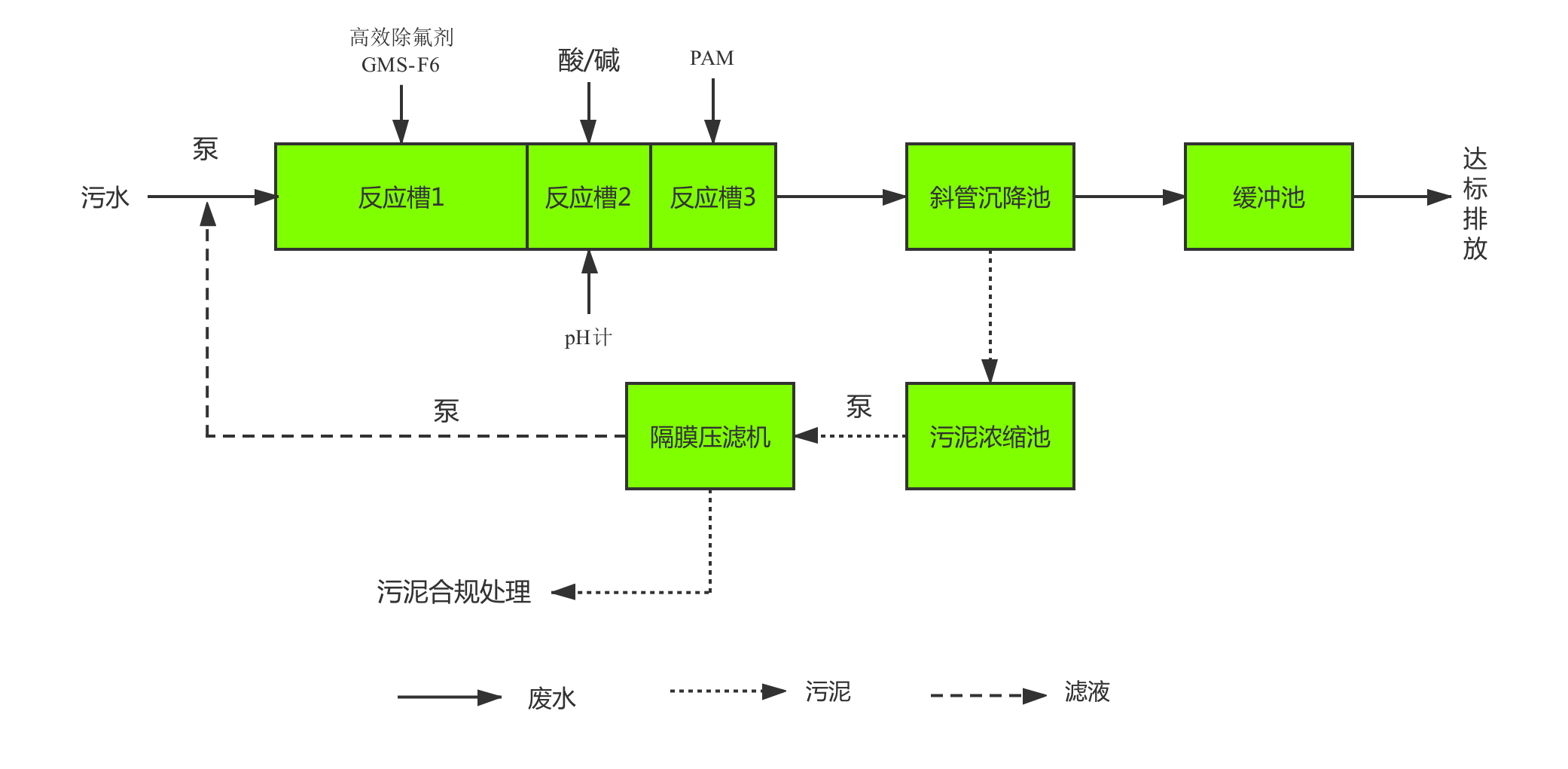 流程圖說明:此處理流程較為簡單,設(shè)定好一定條件即可將污水中氟化物降低到要求值以下。