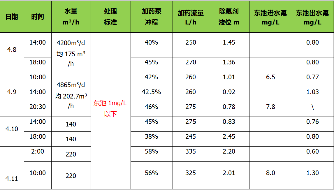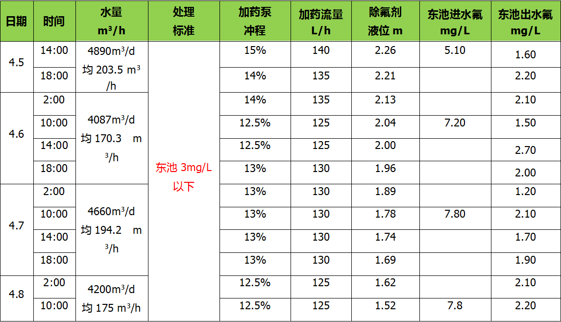 表一:東池出水氟化物按3mg/L以下運(yùn)行