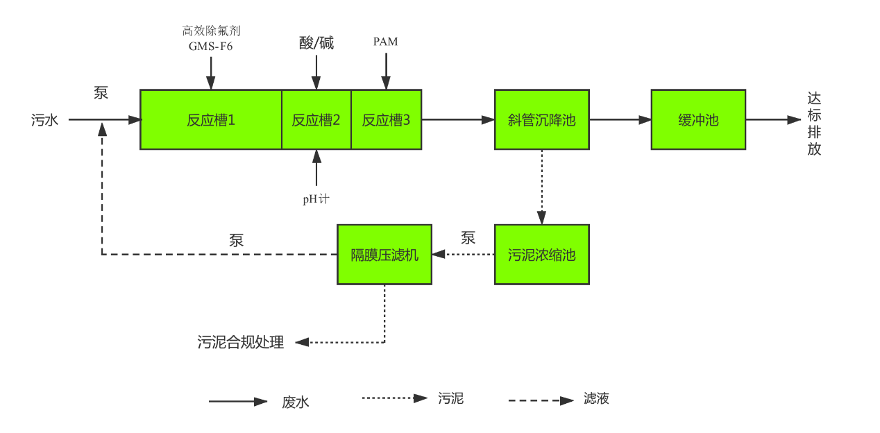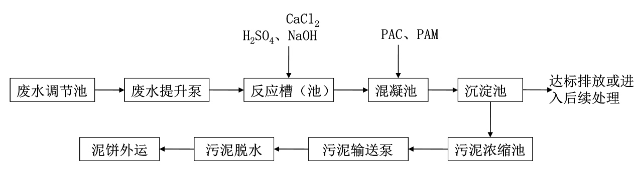 流程圖說(shuō)明:此處理流程較為簡(jiǎn)單,設(shè)定好一定條件即可將污水中氟化物降低到要求值以下。