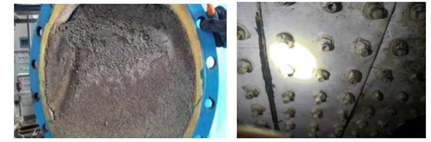 其次,使用鈣鹽運行時,在水流緩慢(吸附塔、過濾器等)和濾徑較小的工段,容易發(fā)生析鹽現(xiàn)象,這會引起管道堵塞及結垢(我司以往客戶使用均出現(xiàn)類似情況,具體如下圖所示),需后續(xù)定期清理,影響運行的穩(wěn)定性。