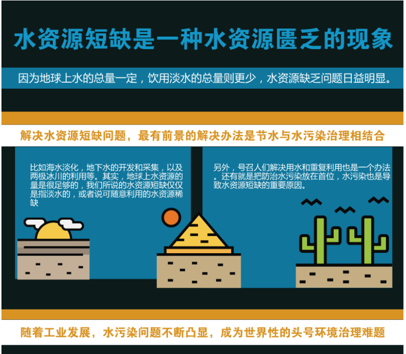 目前,水資源面臨“三大危機(jī)”——水多(河流泛濫,洪澇頻發(fā))、水少(淡水匱乏,干旱荒漠)、水臟(水體污染,生態(tài)惡化)。