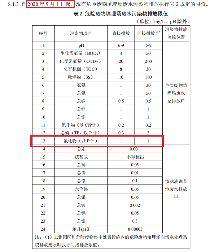 其中,關于危險廢物填埋場廢水污染物排放指標于2020年9月1日起實施,氟化物排放限值為1mg/L。