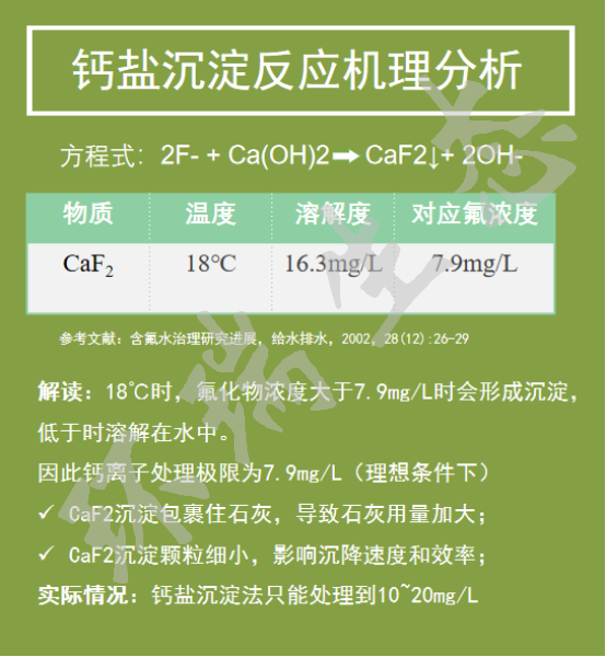 氟化鈣在18 ℃時(shí)于水中的溶解度為16.3 mg/L,按氟離子計(jì)為7.9 mg/L,在此溶解度的氟化鈣會(huì)形成沉淀物。氟的殘留量為10~20 mg/L時(shí)形成沉淀物的速度會(huì)減慢。當(dāng)水中含有一定數(shù)量的鹽類(lèi),如氯化鈉、硫酸鈉、氯化銨時(shí),將會(huì)增大氟化鈣的溶解度。因此用石灰處理后的廢水中氟含量一般不會(huì)低于20~30 mg/L。