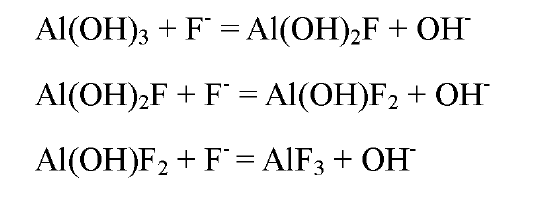 鋁鹽混凝法是去除水中氟離子的常用方法之一,其中堿式氯化鋁的鋁離子與水中氫氧根反應(yīng),生成氫氧化鋁。氫氧化鋁在pH值6-7的范圍,按下列反應(yīng),被吸附在氫氧化鋁膠體顆粒上,發(fā)生沉淀后去除。