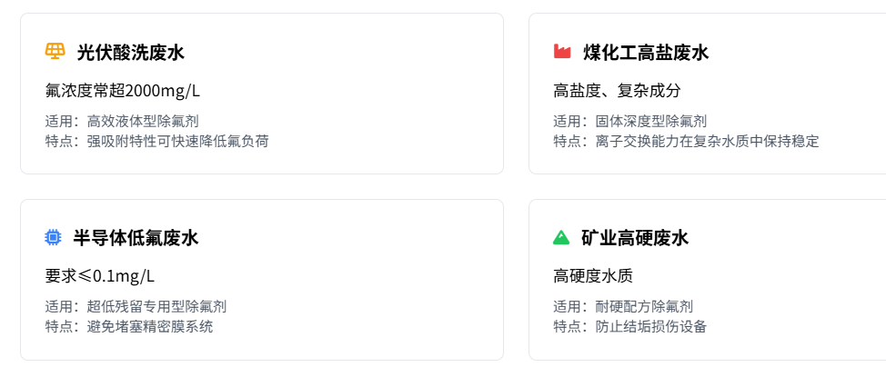 半導(dǎo)體低氟廢水(要求≤0.1mg/L)需超低殘留專用型,避免堵塞精密膜系統(tǒng);